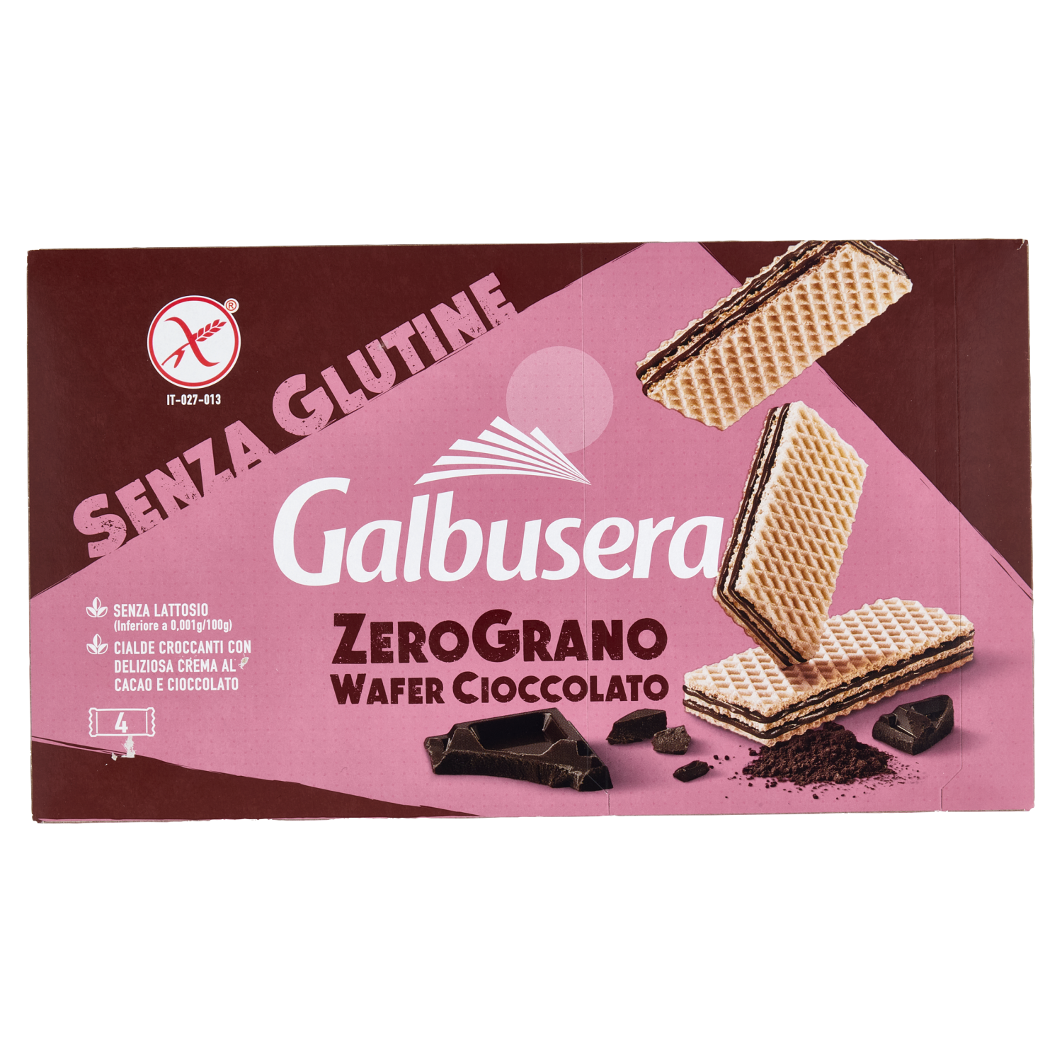 Knusprige glutenfreie Waffeln mit Schokoladencremefüllung von Galbusera. 4 Stück – ohne Gluten, ohne Palmöl, voller Geschmack. Ideal für Zwischendurch!